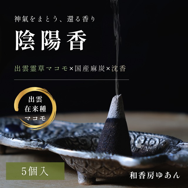 ――凛として、力強く。出雲の記憶を香りに宿して。 出雲在来種のマコモを使った、特別なお香が完成しました。 このお香に使用しているのは、稲が伝わる以前から日本に根付き、命を繋いできた「出雲在来種のマコモ」。 土地の氣を映しながら、出雲の地に代々受け継がれてきた、特別な存在です。 現在流通しているマコモの多くは、マコモダケを収穫する東南アジア原産の“栽培種”ですが、 このお香に使っているのは、日本に古くから自生してきた在来種のマコモ。 食用に適した茎太りを持たない分、根がびっしりと張り、葉は細く凛として、香りに宿る氣もまた格別です。 この希少な出雲在来種マコモを、無肥料無農薬で大切に育て続けてきた出雲の農家さんから分けていただき、今年(R7年)の初夏、青葉がまっすぐに伸び盛る時期に収穫・乾燥。自家で丁寧に祭粉(さいふん)しました。 マコモがもつ本来のエネルギーと香り立ちを、できる限りそのまま閉じ込めるように仕上げ、 その香りに合わせて、調香も一から最適化しています。 従来品よりも一層深く、しなやかで、力強い。 そんな奥行きのある香りに仕上がりました。 出雲の地に根づく命の記憶と、凛とした氣を纏った香り。 この特別な「出雲在来種マコモの香り」を、ぜひご体感ください。 ============================ 神気をまとう、還る香り 出雲産マコモ × 麻炭 × 沈香・白檀 陰と陽の霊草と香料を丁寧に調香した、唯一無二の“整える香り”です。 ただ香るのではなく、整えるために。 この香は、空間を“清め”、心を“調える”ための香です。 ――マコモは陰、麻は陽。 対極でありながら、どちらも古より神に仕えてきた霊草。 その陰陽を調和させ、沈香と高級白檀を重ねることで、深く、静かで、奥行きのある香りに仕上げました。 「出雲国マコモ香」が日常に寄り添うやさしい香りなら、 この陰陽香は、“深く整える時間”のための香。 心がざわつくとき。 空間の“氣”が重たく感じるとき。 この香を焚いてみてください。 呼吸が静かに深まり、意識が内へと還っていく感覚を味わえるはずです。 香りを焚き染めることで、空間に香が宿り、 やがて、自分の在り方にも静かな変化が訪れます。 仏教でいう「薫習(くんじゅう)」── 香りが習慣となり、心を形づくるという考え方です。 “香る”から、“整う”へ。 陰陽香は、あなたの本来の力を静かに引き出す香りです。 ■ 内容量 コーン型 10個入り(高さ 約2cm・燃焼 約10分) ※5個入りもございます ■ 香原料 出雲産マコモ葉パウダー、麻炭、沈香、高級白檀、その他天然香料 ■ ご使用上の注意 火の取り扱いには十分ご注意ください。 高温多湿・直射日光を避けて保管してください。 アレルギーのある方は使用をお控えください。