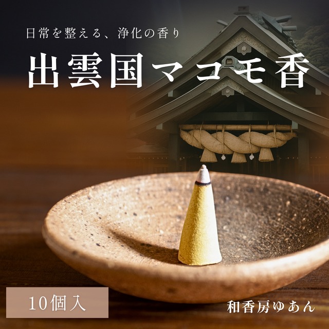 ――すっと澄みわたる、清らかな香り。 一年に一度だけの、特別な香りが出来上がりました。 “日常を整える香り”として愛されてきた『出雲国マコモ香』に、 今年度産の”新物マコモ”を贅沢に使用した、”期間限定版”が登場しました。 初夏、出雲の地で瑞々しく、力強く育ったマコモの葉。 その一枚一枚を、自家で丁寧に祭粉(さいふん)し、より深く、豊かな香りへと仕立てました。 ◎こだわりのポイント ・今年収穫された出雲産マコモを、自家で丁寧に祭粉(さいふん) ・従来品よりマコモの配合量を増量 ・白檀の中でも最も良質とされる「老山白檀」を贅沢に使用 * マコモは、稲が伝わる以前から人々の暮らしに使われてきた日本古来の植物。 現在も出雲大社のしめ縄や神事に使われるなど、“氣を整える霊草”として今もなお、大切に受け継がれています。 ーーこんな時におすすめーー ✔ 空気を整えたいとき ✔ 心を落ち着けたい夜に ✔瞑想や読書など、自分を整える時間に ✔ 香り初心者の方にもおすすめ 新物マコモならではの、生命感あふれる澄んだ香り。 今だけの、力強くも優しく包み込む香りを、どうぞお試しください。 ■ 内容量 コーン型 10個入(高さ 約2cm・燃焼 約10分) ※5個入りもございます ■ 香原料 R7年出雲産マコモ葉パウダー、老山白檀、その他天然香原料 ■ ご使用上の注意 ・火の取り扱いにご注意ください ・高温多湿・直射日光を避けて保管してください ・アレルギー体質の方は使用をお控えください ※原料由来により、黒い斑点が見えることがありますが品質に問題はございません。