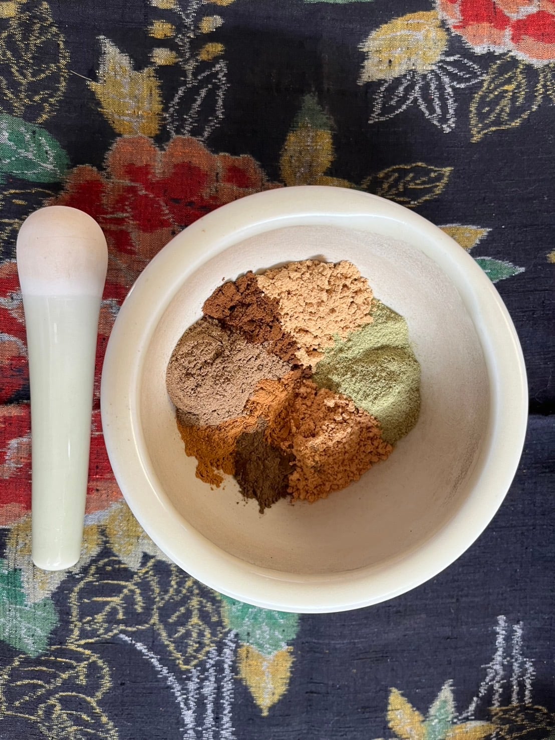 Sacred Japanese herbs such as Makomo, hemp charcoal, and pine needles—